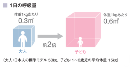子どもは大人に比べて、呼吸の回数が多いといわれています。 例えば同じ時間を過ごしても、大人よりもたくさんの空気を体の中に取り込んでいるんです。[1]