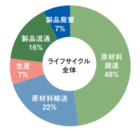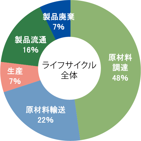 製造から廃棄までのCO₂排出量を算定したところ、原材料調達段階の排出が48%を占め、ライフサイクル全体におけるCO₂排出量は2.0kg、他製品※2と比較して、環境負荷の非常に小さい製品となります。