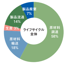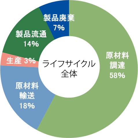 製造から廃棄までのCO2排出量を算定した所、原材料調達段階の排出が58%を占め、ライフサイクル全体におけるCO2排出量は5.0kg、他製品※3と比較して、環境負荷の非常に小さい製品となります。