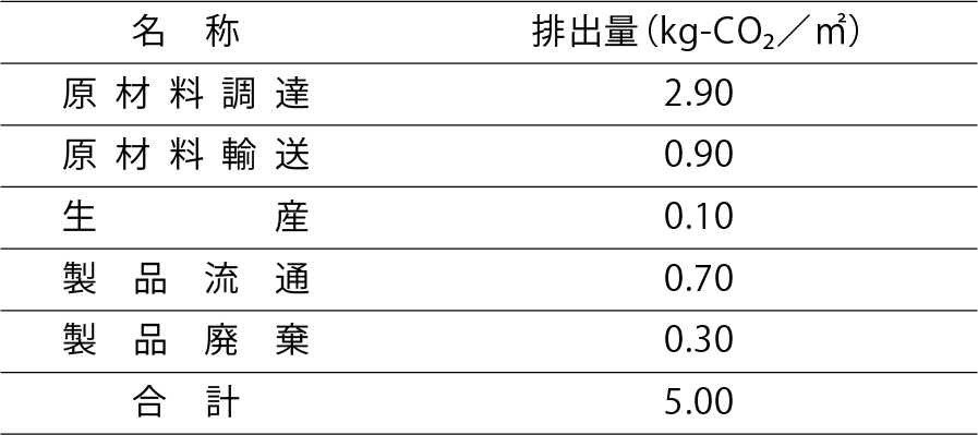● 算定対象:薩摩中霧島壁SN-1 ● 機能単位:㎡ ● 算定範囲:製造(原料調達、生産)、流通(出荷)、廃棄 ● 算定方法:活動量 弊社収集データによる ● 排出原単位:IDEA_V2.0及び算定・公表・報告制度の係数 ● 輸送:原材料調達、トンキロ法(距離は弊社収集データより設定) 出荷 トンキロ法(輸送シナリオ) 廃棄 トンキロ法(輸送シナリオ) |